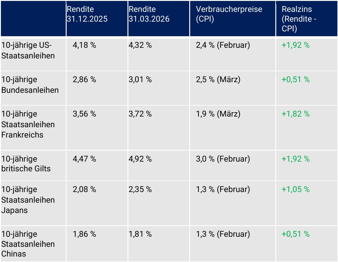 Die Rentenmärkte lieferten im 1. Quartal 2026 Renditeanstiege zwischen 0,14 % (USA) und 0,45 % (UK) bezüglich der jeweiligen 10-jährigen Staatsanleihen. Nur in China kam es zu einem Renditerückgang (0,05 %).
