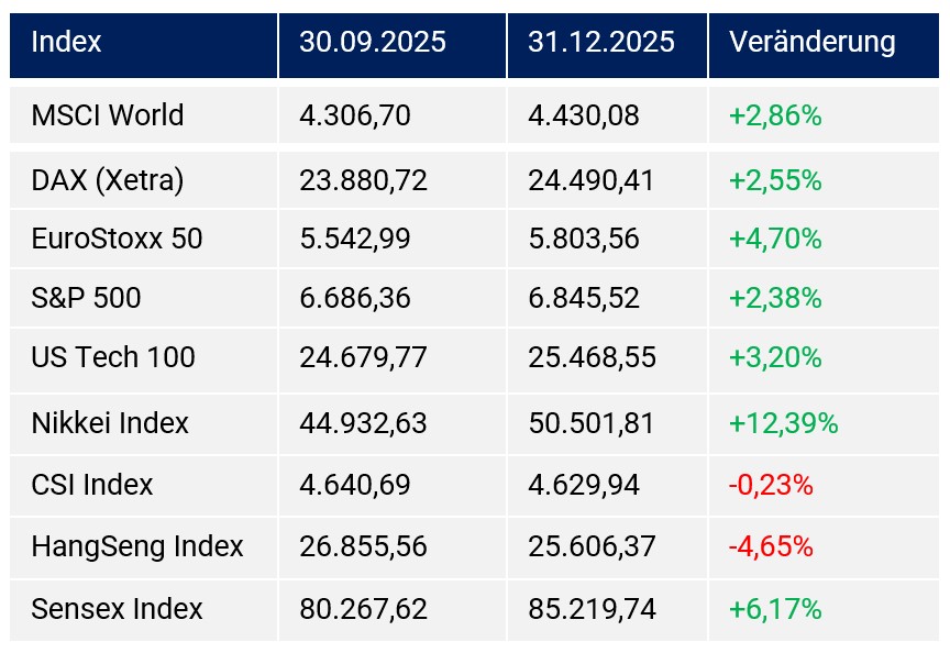 An den Finanzmärkten ergaben sich im Herbstquartal 2025 teilweise starke Neubewertungen. Die stabile bis leicht freundliche globale Konjunkturlage war neben den Zinssenkungen der Federal Reserve und der Bank of England als auch dem Verzicht der USA, die Zollkonflikte weiter zu eskalieren, wesentlich verantwortlich für die überwiegend freundliche Performance der Aktienmärkte ex China und Hongkong. Die geopolitischen Herausforderungen und/oder Eskalationen stellten neben dem „US-Shutdown“ im 4. Quartal 2025 nur kurzfristige Belastungen für die Aktienmärkte dar.