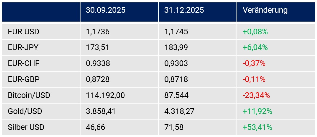 Der Euro konnte im 4. Quartal 2025 weitgehend die vorherige Stärke gegenüber dem USD verteidigen und sogar gegenüber dem JPY ausbauen. Hinsichtlich der unterproportionalen Performance der europäischen Rentenmärkte gegenüber den USA als auch der Tatsache, dass Produktionskapazitäten aus der Eurozone in die USA verlagert werden, stellt sich die Frage, welche Kapitalströme zu dieser Euro-Performance führen. Das gilt umso mehr, als dass sich die geowirtschaftlichen Bedingungen durch die US-Zollpolitik für die Eurozone markant verschlechterten und die Leistungsertüchtigung der USA, messbar an den starken und unerwarteten Wachstumsdaten, bemerkenswert war und ist. Gegenüber dem GBP und CHF kam es zu insignifikanten Rückgängen.